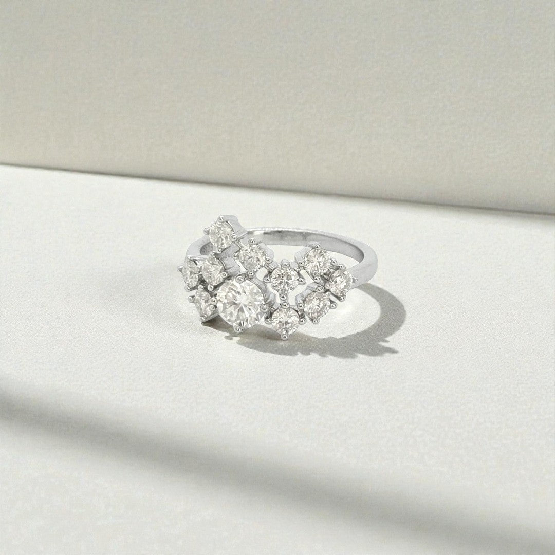 Set with moissanites arranged in an asymmetric rhythm, the ring feels alive on the hand. Each stone catches the light differently, bringing a sense of energy, freedom, and ease. Bold yet delicate, it adds presence without feeling heavy.