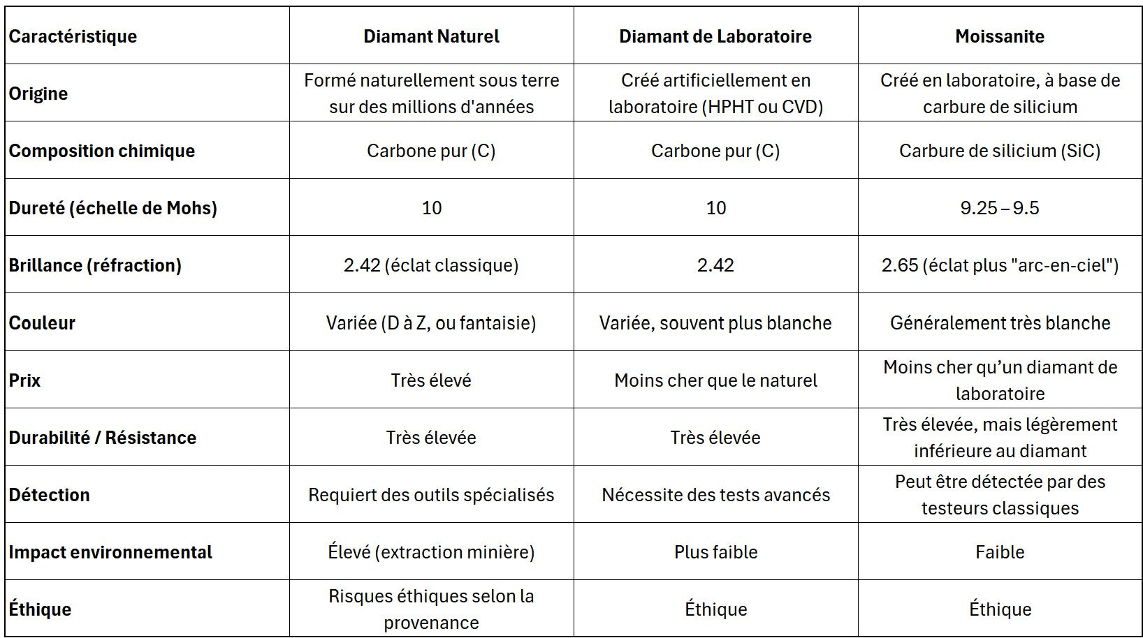 Voici un tableau comparatif clair entre le diamant naturel, le diamant de laboratoire et la moissanite, basé sur leurs principales caractéristiques :
